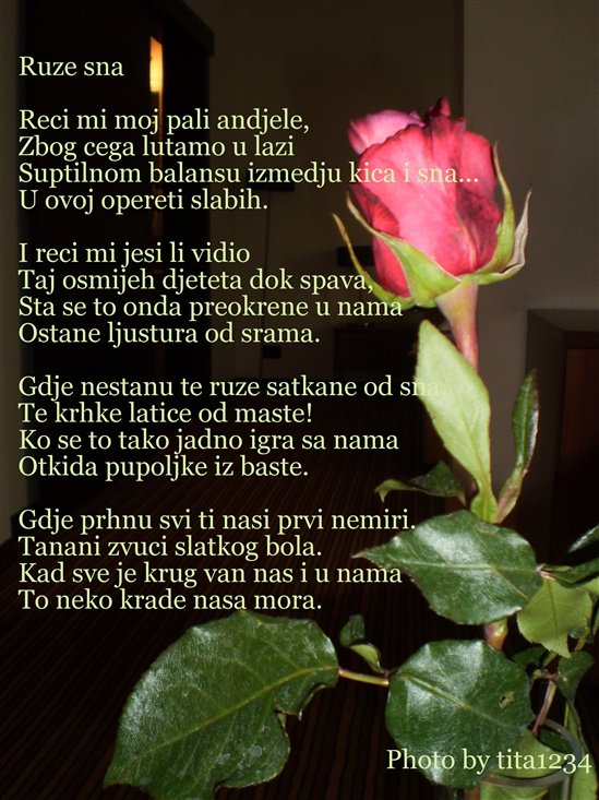 I,sve dalje ides mojim mislima i mojom ljubavlju a znam da pripadas drugoj,znam da gladis njenu kosu,ljubis ruzicaste usne i tamne oci i ne osjecas moju ljubav-ljubav 1-oga djeteta,a mislila sam kad sam te upoznala da ce sve biti lijepo?!